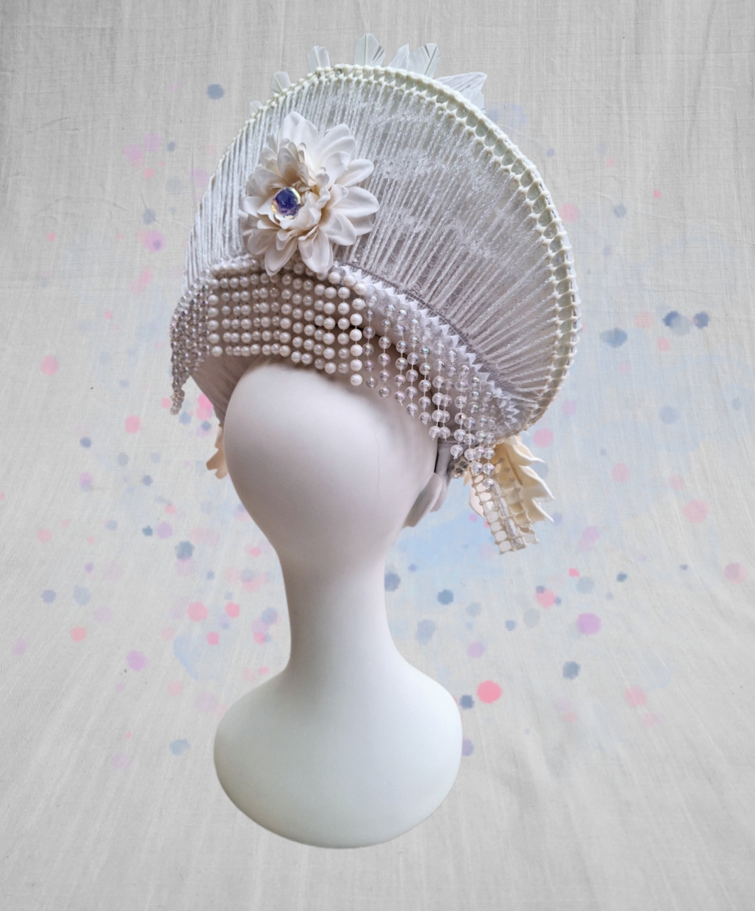 voile stof, zijden bloemen, parels, strass, veren, lint, kralen, zilver garen
