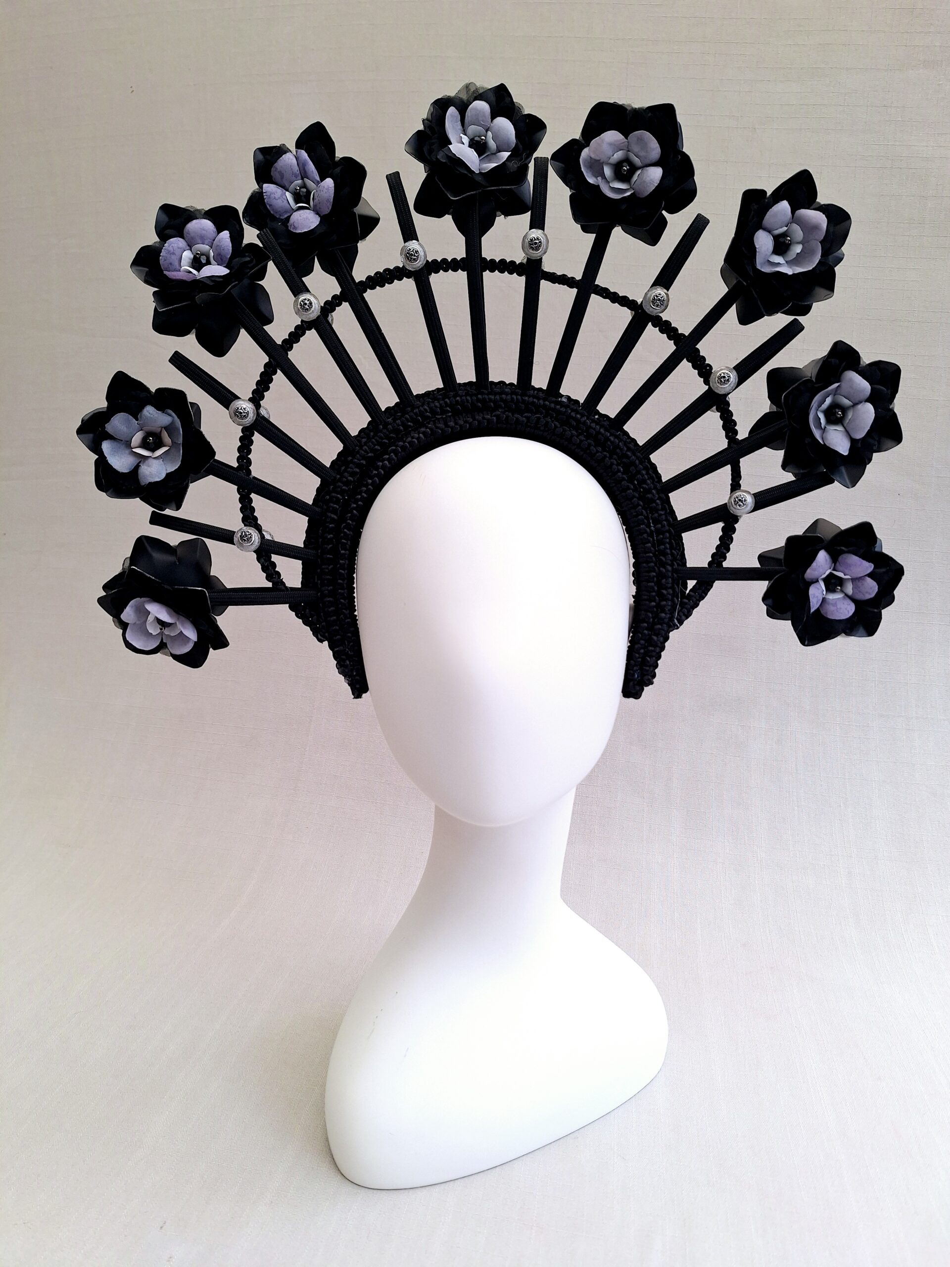 macrame van zijden koord, parels en kralen, strass, kunsttof, zijden bloemen